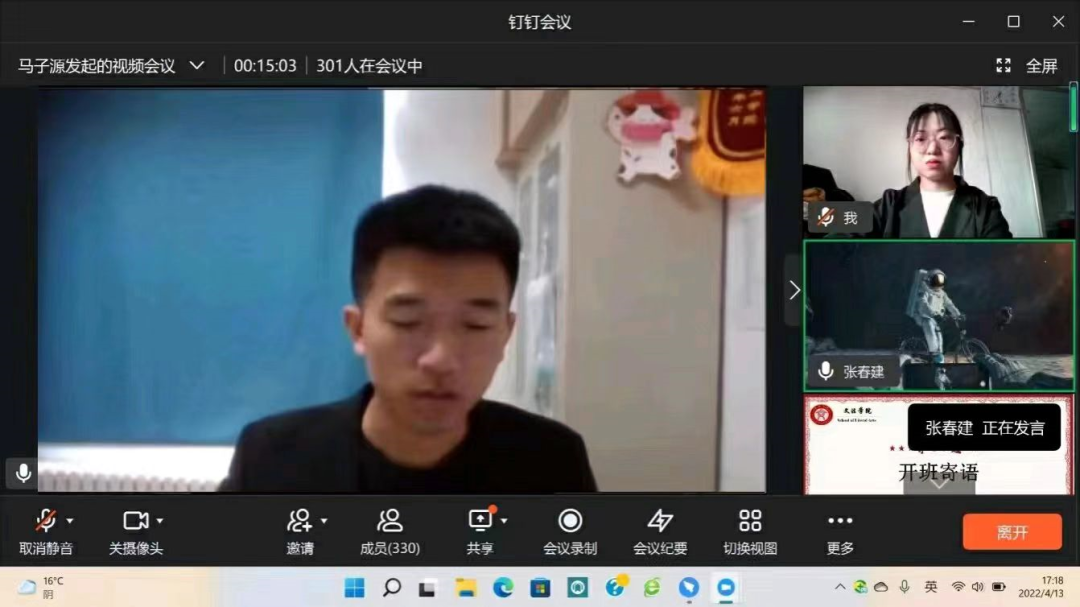 (文法学院新闻中心 记者/团支部)为庆祝建团100周年,组织团员青年学习贯彻习近平总书记重要讲话精神,学习党领导青年运动的光辉历程,把握共青团在党的领导下团结带领一代代青年跟党奋斗的光辉历程,增强永远跟党走的信念信心。4月13日,文法学院线上举办“琢玉工程”学生干部培训班开班仪式暨第一讲。团总支指导老师张春建、学生会指导老师张琦、雷锋连指导老师王思齐、新闻中心指导老师王妍、学生社团工作部指导老师肖雪、心理健康教育与服务中心指导老师阿娜尔及全体辅导员老师、学生组织主要负责人、各年级班长团支书参加活动。