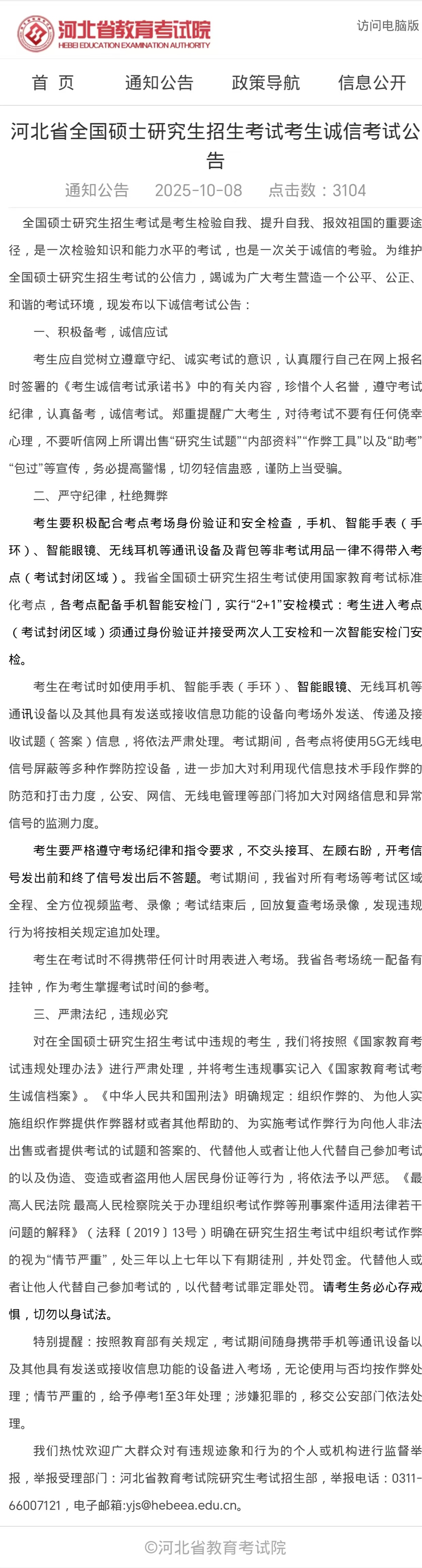 河北省全国硕士研究生招生考试考生诚信考试公告