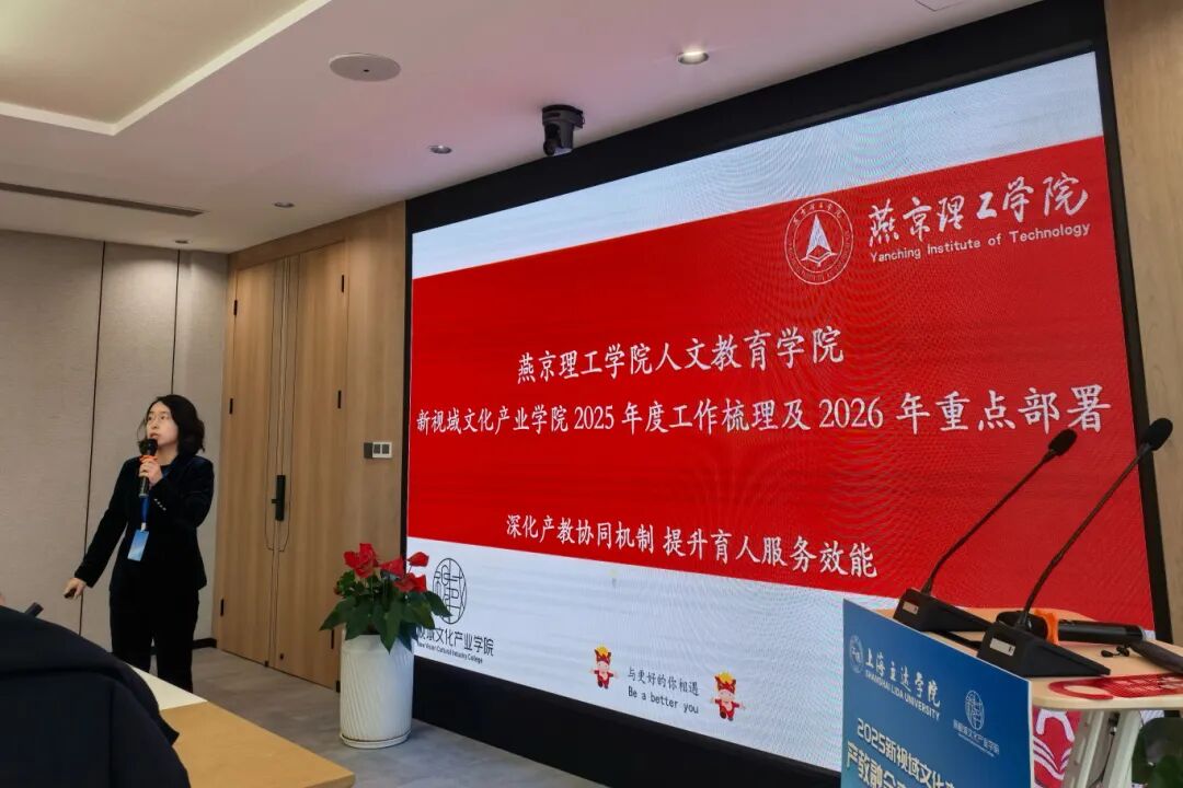 在院校分享环节,燕京理工学院人文教育学院院长助理兼党总支副书记孙雅钗作为首位高校代表,详细汇报了燕京理工学院2025年新视域文化产业学院的建设进展与发展成果。她系统介绍了一年来学院开展的108场系列活动及其对师生成长的积极影响,阐述了学院从1.0基础建设阶段到2.0深化整合阶段的发展历程,并前瞻性地提出了面向未来的3.0升级规划。汇报内容扎实、视野开阔,获得了与会各院校代表的一致好评。